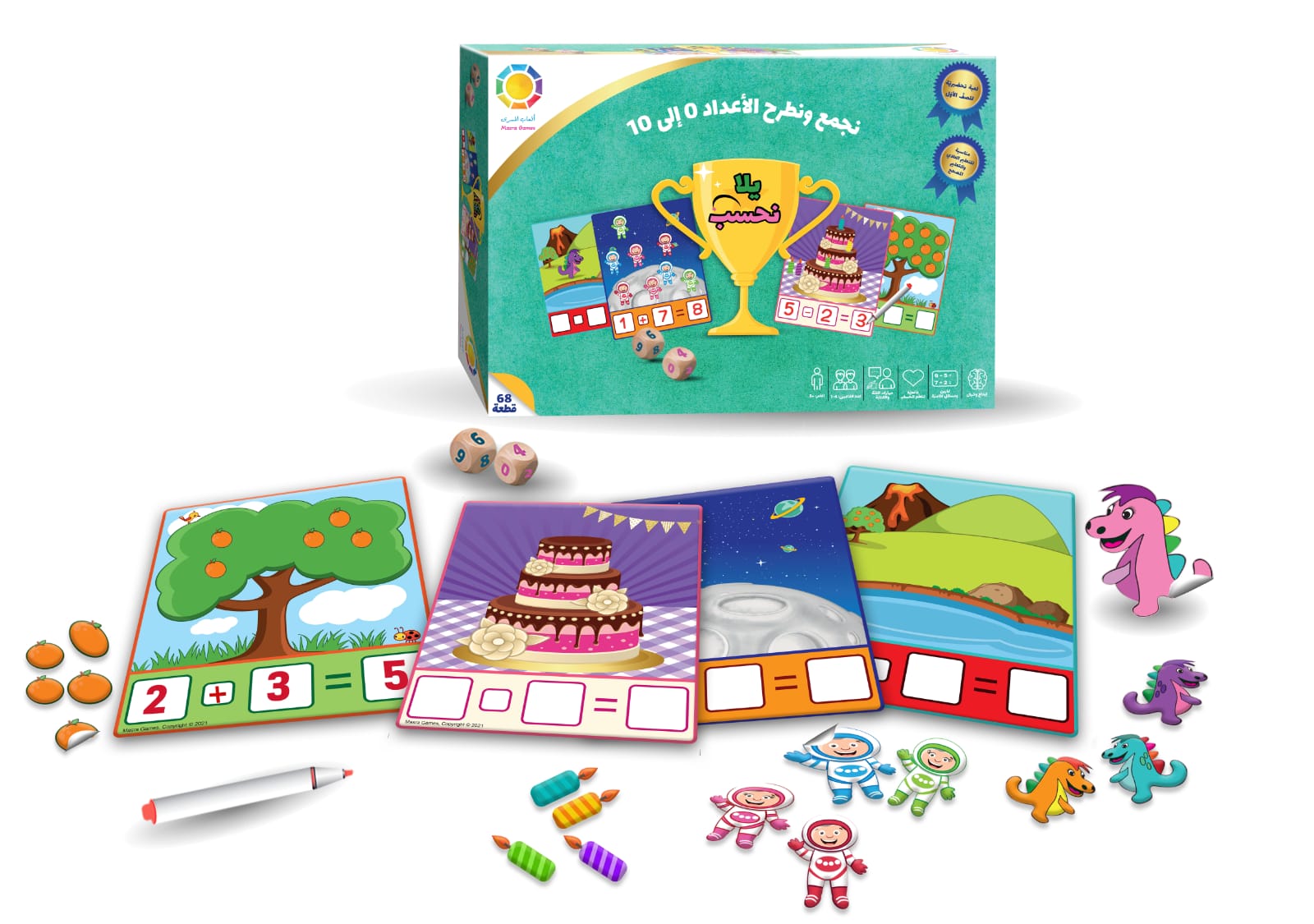 ارموا حجار النرد وابدأوا بعدّ القطع المناسبة ووضعها على الالواح المناسبة، ثم اكتبوا المعادلة الحسابية واحسبوا