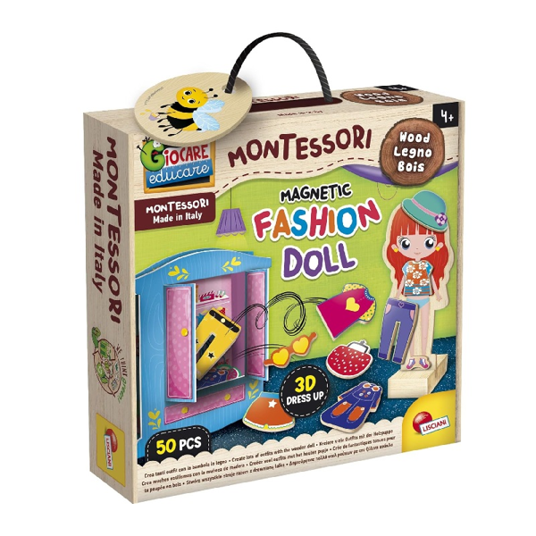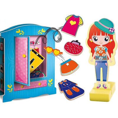 لعبة تعليمية ممتعة للأطفال مستوحاة من طريقة مونتيسوري, مصنوعة من الخشب, وتحتوي على أكثر من 50قطعة لتلبيس الدميةبأزياء مختلفة باستخدام المغناطيس.